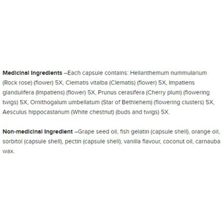 Grape seed oil, fish gelatin (capsule shell), orange oil, sorbitol (capsule shell), pectin (capsule shell), vanilla flavour, coconut oil, and carnauba wax.