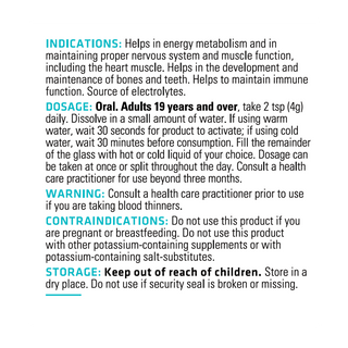 Helps in energy metabolism and in maintaining proper nervous system and muscle function, including the Cardio Health muscle. Helps in the development and maintenance of bones and teeth. Helps to maintain immune function. Source of electrolytes.