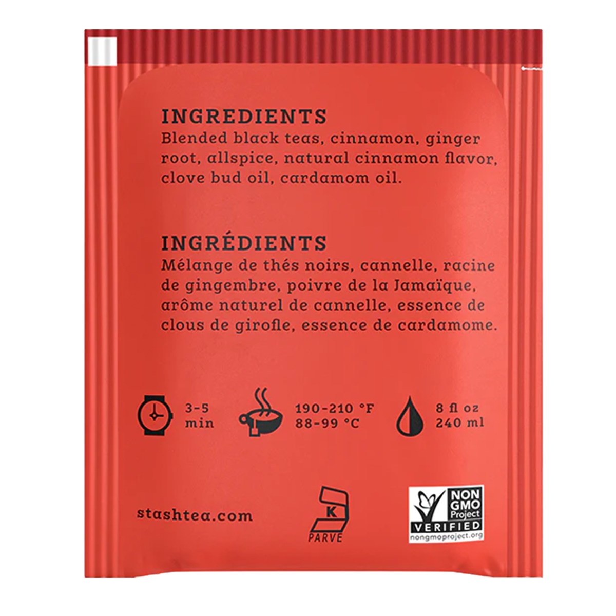 Blended black teas, cinnamon, ginger root, allspice, natural cinnamon flavor, clove bud oil, cardamom oil.