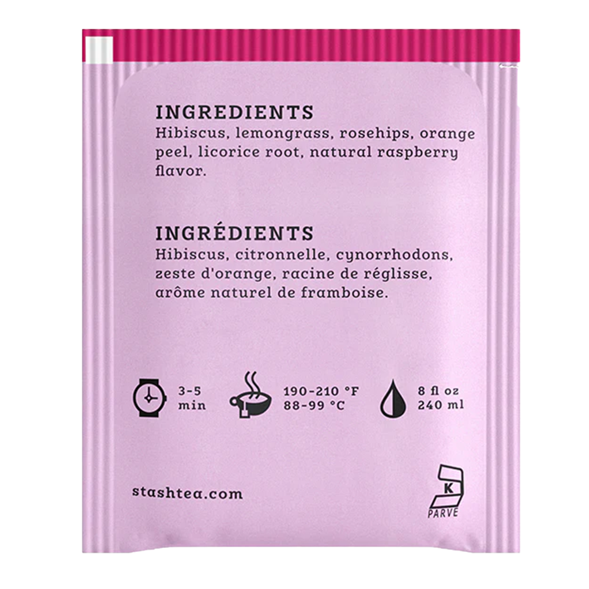 Hibiscus, lemongrass, rosehips, orange peel, licorice root, natural raspberry flavor.